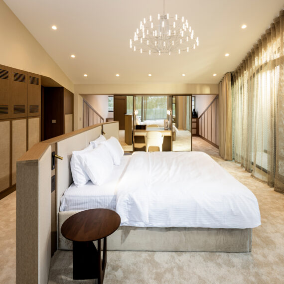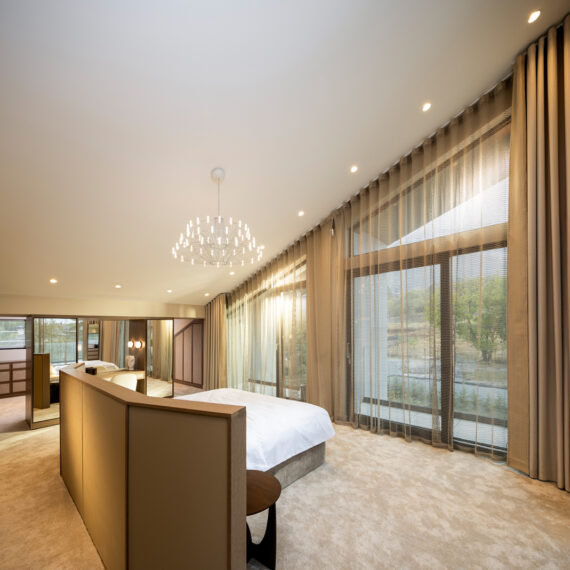 На втори етаж са разположени три просторни спални с квадратура над 40 м2 всяка, със самостоятелни бани, гардеробни, и невероятни гледки
