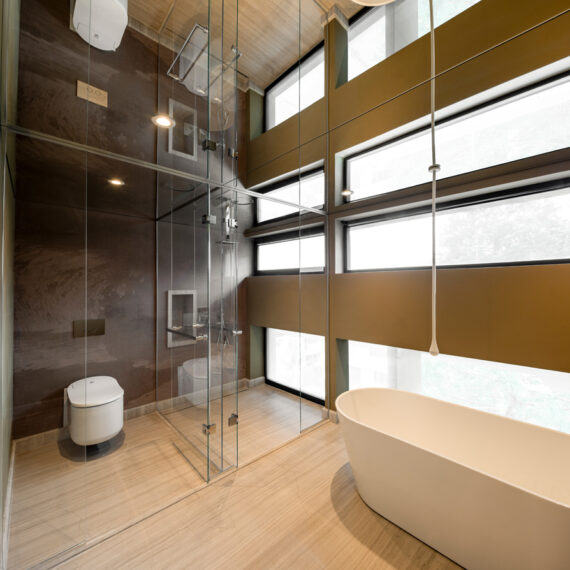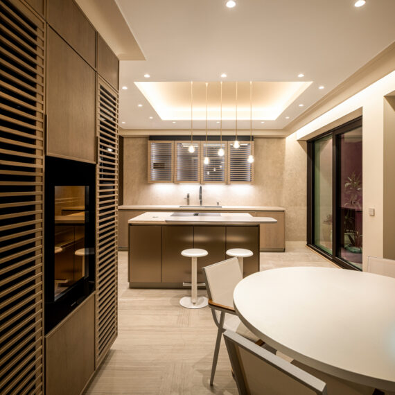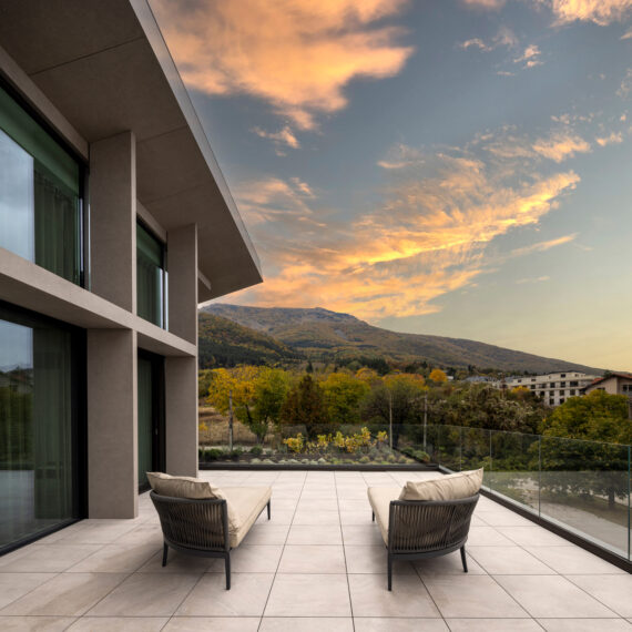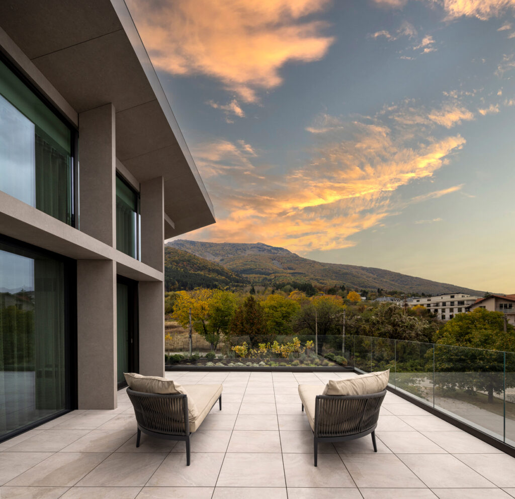 Фасадата е вентилируема, изпълнена изцяло с италиански материали от най-висок клас, а дограмата е Schüco – плъзгане с повдигане, осигуряваща максимална изолация и визуална лекота. Тази комбинация прави сградата изключително енергийно ефективна, а в съчетание с фотоволтаичната система домът достига параметри, близки до пасивна къща – пример за съвременна архитектура, създадена с мисъл за бъдещето.