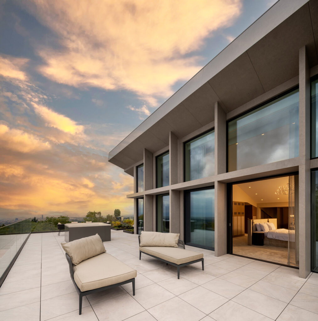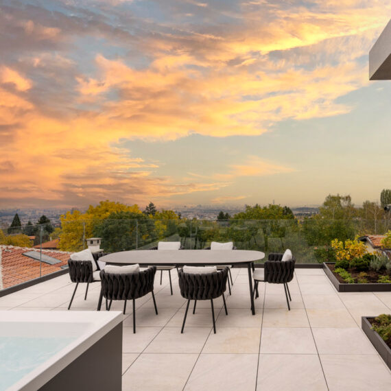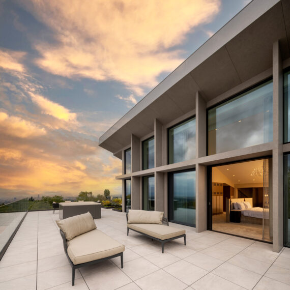 Имотът предлага несравнимо уединение, простор и удобства на световно ниво, допълнени от впечатляващи панорамни гледки – към града от едната страна и към планината от другата.